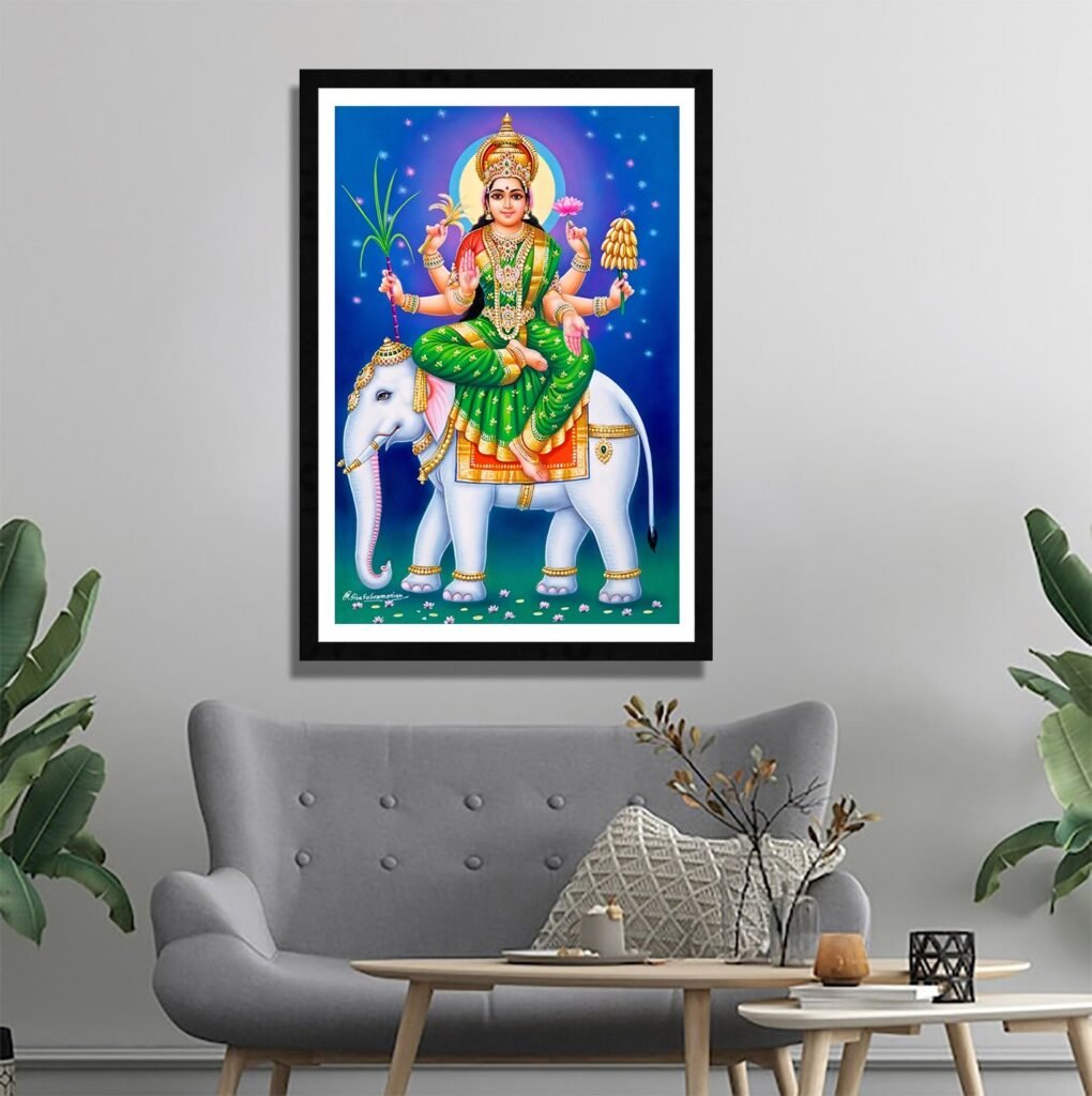 1. Lakshmi Painting: This could refer to a general painting of the goddess Lakshmi, often depicted sitting on a lotus flower with gold coins flowing from her hands, symbolizing wealth and prosperity.