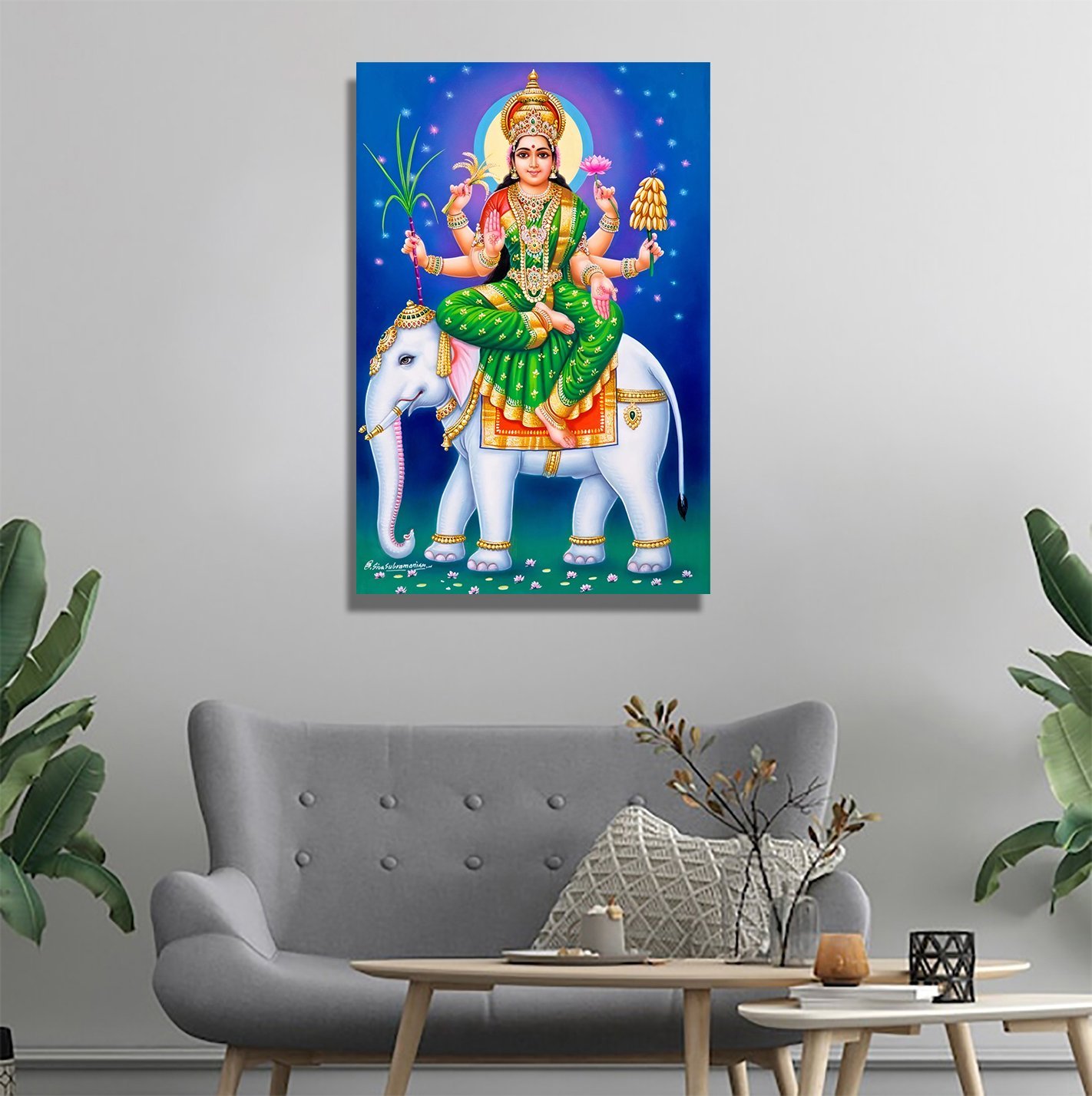 1. Lakshmi Painting: This could refer to a general painting of the goddess Lakshmi, often depicted sitting on a lotus flower with gold coins flowing from her hands, symbolizing wealth and prosperity.