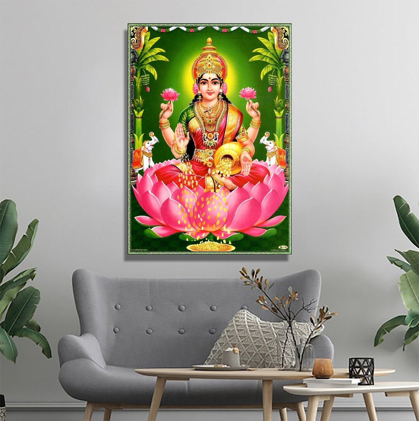 1. Lakshmi Painting: This could refer to a general painting of the goddess Lakshmi, often depicted sitting on a lotus flower with gold coins flowing from her hands, symbolizing wealth and prosperity.