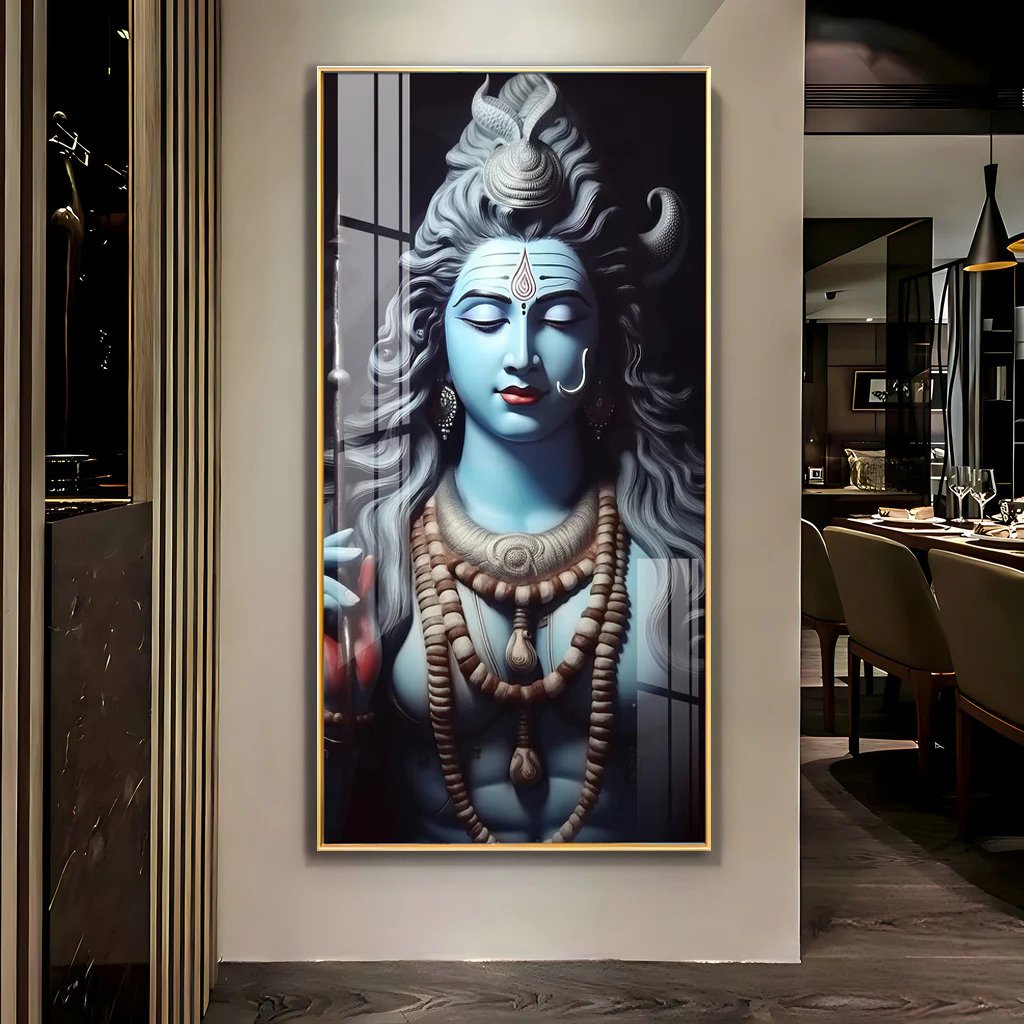 Elevate your home decor with the Shiv Shambhu Premium Acrylic Vertical Wall Art, an exquisite piece from Modern Arts India that brings divine energy and spiritual serenity to any space. Crafted with a 3mm high-quality acrylic sheet, this artwork ensures durability and clarity, while the 2.4cm thick premium luxury golden aluminum metal frame adds a touch of opulence and sophistication.